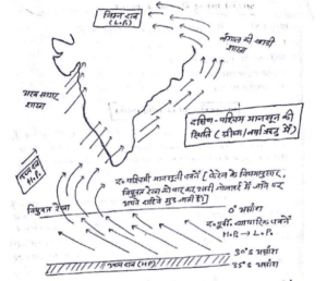- – ग्रीष्म काल में तापीय विषुवत रेखा के उत्तरी खिसकान के कारण अंतः ऊष्ण अभिसरण (ITCZ) विषुवत रेखा के उत्तर में होता है। विषुवतीय पछुवा पवनें अपनी दिशा संशोधित कर भारतीय उपमहाद्वीप पर बने निम्न दाब की ओर प्रवाहित होने लगती है। यह दक्षिण – पश्चिम मानसून को जन्म देती है।