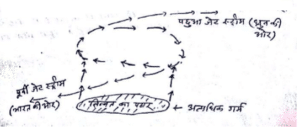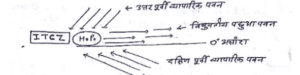 ITCZ :- उ० पू० व्यापारिक पवनों एवं द० पू० व्यापारिक पवन का मिलन स्थल अंतर – उष्ण कटिबंधीय अभिसरण क्षेत्र (ITCZ) होता है। यहाँ दोनो पवनों के मिलने विषुवतीय पछुआ पवनों की उत्पति होती है।