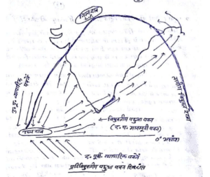i) अरब सागरीय शाखा का वृाष्टि छाया क्षेत्रः पश्चिमी घाट पार करने के पश्चात् वर्षा लाने वाली वायु धाराएं पूर्वी ढ़लानों पर ऊपर की ओर चली जाती हैं। इसके फलस्वरूप वृाष्टि छाया क्षेत्र ( Rain Shadow Area) का निर्माण होता है। पहाड़ की ऊँचाई जितनी अधिक होगी, उतना ही अधिक वृाष्टि छाया क्षेत्र का निर्माण होगा।