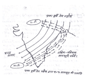 – ” उष्ण पूर्वी जेट स्ट्रीम द्वारा दक्षिण पश्चिम मानसून की उत्पीतः –